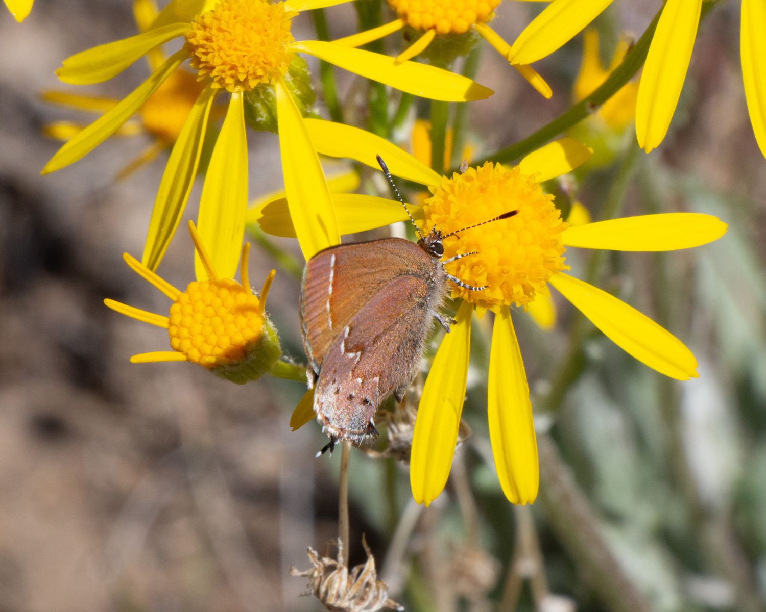 Juniper Hairstreak (Callophrys gryneus) on Woolly Groundsel (Packera cana), Horse Ridge, Deschutes County, Oregon (2024-06-08)